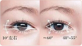 内眼角约48°,外眼角约60°